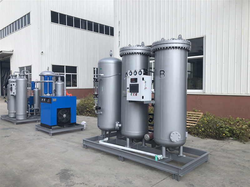 變壓吸附制氧裝置以潔凈的壓縮空氣為原料,采用高品質的沸石分子篩作為吸附劑,在一定的壓力下,從空氣中制取氧氣。經過純化干燥的壓縮空氣,在吸附器中進行加壓吸附、減壓脫附。由于空氣動力學效應,氮在沸石分子篩微孔中擴散速率遠大于氧,氮被沸石分子篩優(yōu)先吸附,氧在氣相中被富集起來,形成成品氧氣。然后經減壓至常壓,吸附劑脫附所吸附的氮氣等雜質,實現再生。一般在系統(tǒng)中設置兩個吸附塔,一塔吸附產氧,另一塔脫附再生,通過PLC程序控制器控制氣動閥的啟閉,使兩塔交替循環(huán),從而取得純度較高的氧氣(93%±3%)。