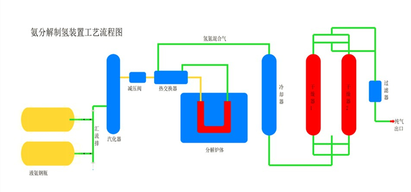 液氨經(jīng)氨減壓閥減壓,進(jìn)入水汽化器,然后進(jìn)入熱交換器和氨分解出來的氫氣進(jìn)行熱量交換,進(jìn)入分解爐體里,分解成氫氮混合氣,出來的熱氣體和氨進(jìn)行熱量交換,再進(jìn)入水冷卻器冷卻后,即可送到使用點(diǎn)。