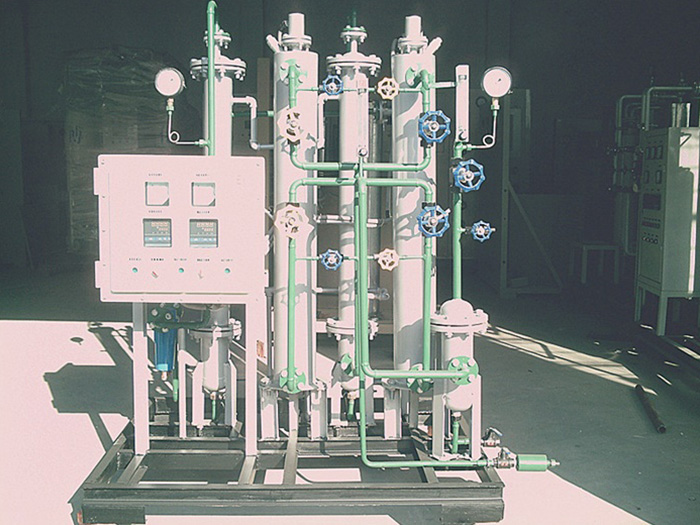 ??以純度大于97%的工業(yè)氫氣為原料氣,采用鈀觸煤為催化劑,通過氧和氫生成水,再通過冷凝干燥兩級(jí)處理,達(dá)到除氧和水的目的,最后再通過除塵過濾器,去除氫氣中的塵埃顆粒等。